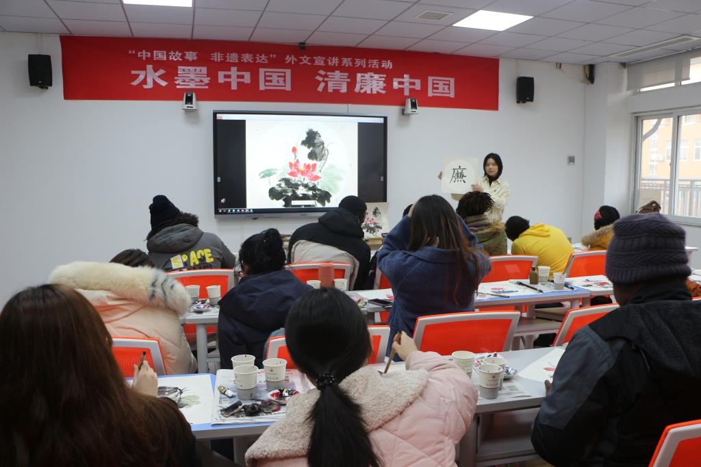 在国画老师的讲解和现场教学下,中外学生用毛笔现场创作国画“莲”,在一笔一墨中融入对清廉思想的感悟。虽然留学生中有不少是初次接触国画,但每一位留学生都热情尝试创作,并在创作过程中体验了中国传统文化的艺术魅力。