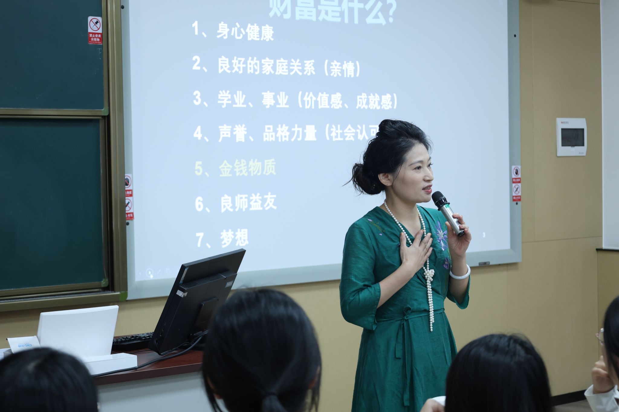 庄雪芬校友以亲切自然的讲述,分享了从外语专业跨入心理行业创业的转型历程。她分析到,人生万事关键取决于“人”这一灵活主动因素,人对事物的理解将会开拓其本身的思维见地。在“财富”定义上,庄雪芬从七大方面解读:身心健康、良好的家庭关系、事业、声誉、品格、良师益友、金钱物质、梦想,重新定义了“财富”的丰富内涵,引导同学们走出对财富的单一认知,建立更全面的人生价值观。之后,庄雪芬还结合自身阅读与实践经验,详细解读“价值”。她认为,当下择业观应从“找工作”到“工作找”转变,不断提高自己创造价值的能力,培养贡献的能力。她特别设计了“财富7灯”自我评估表、“美德卡”、“梦想板”环节,邀请同学们现场自评并分享感受。这一互动方式极大增强了讲座的参与感和实用性,帮助同学们在轻松的氛围中反思自身现状、明确未来方向。